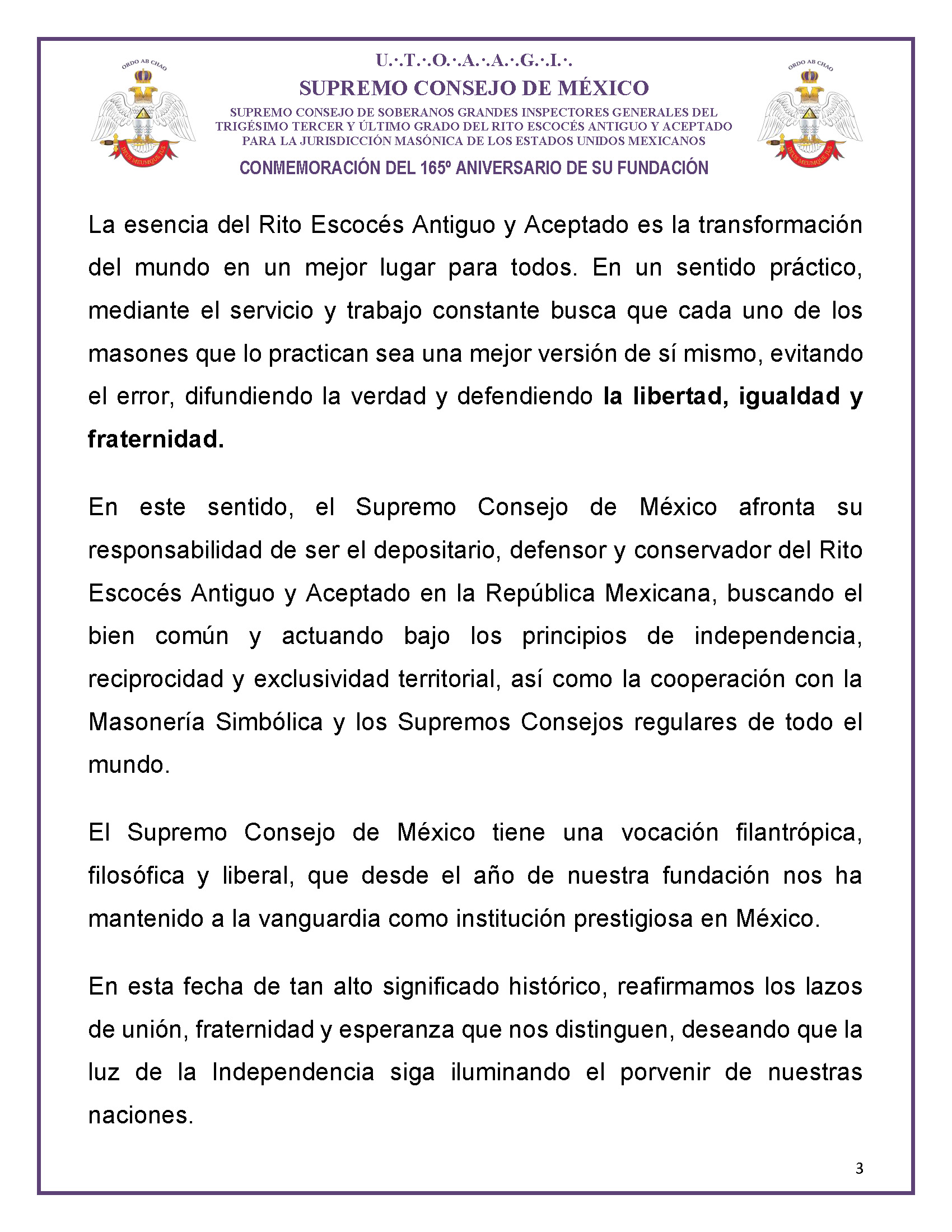 Asimismo, reafirmó la responsabilidad del Supremo Consejo de México como depositario, defensor y conservador del Rito en el país, actuando bajo principios de independencia, reciprocidad y cooperación con la Masonería simbólica y los Supremos Consejos regulares del mundo. Destacó también su vocación filantrópica, filosófica y liberal, que lo mantiene como una institución de prestigio.