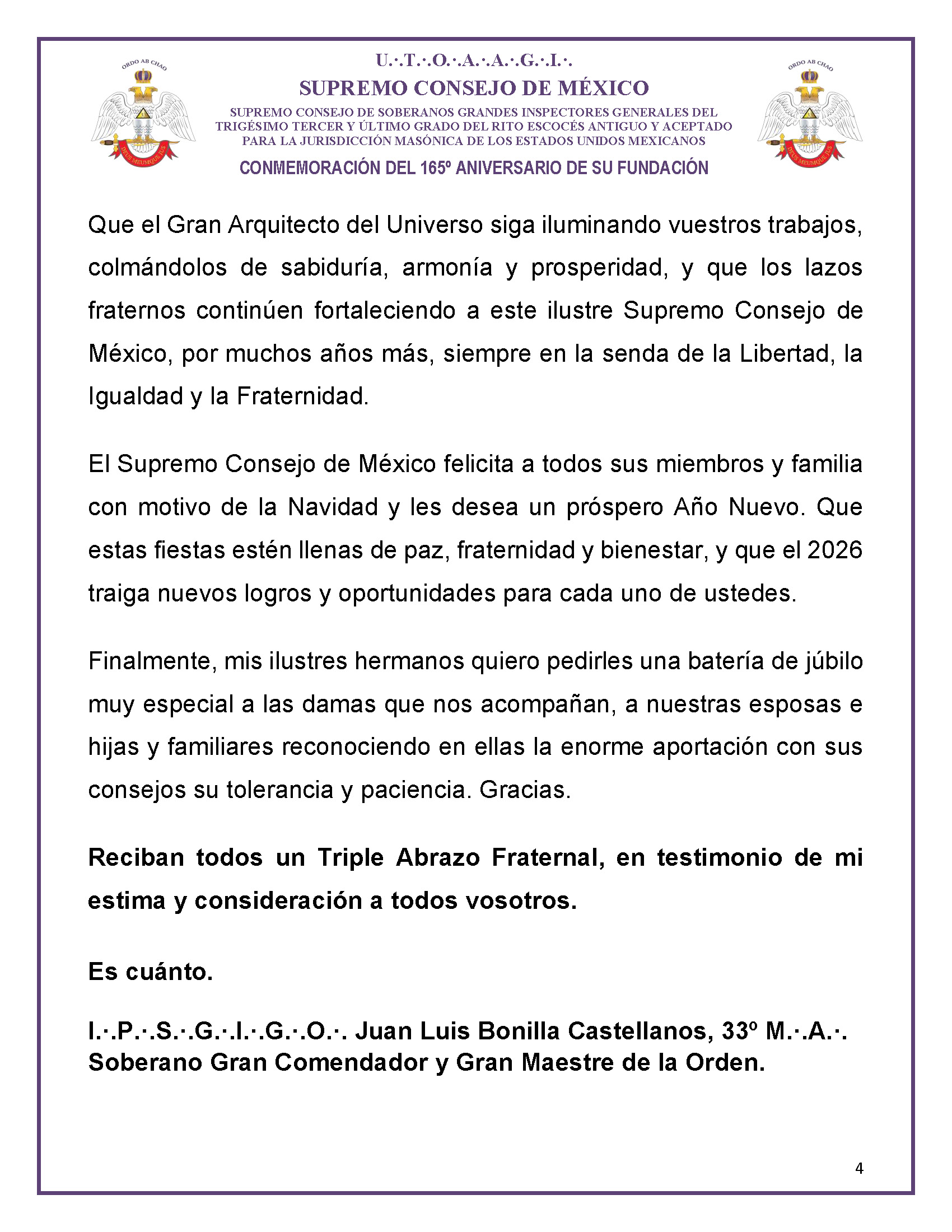 Finalmente, hizo un llamado a fortalecer los lazos de fraternidad y unidad, deseando prosperidad, armonía y nuevos logros para todos sus miembros, así como paz y bienestar en las celebraciones de fin de año.