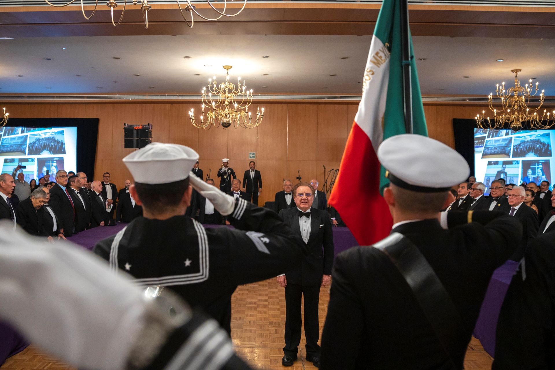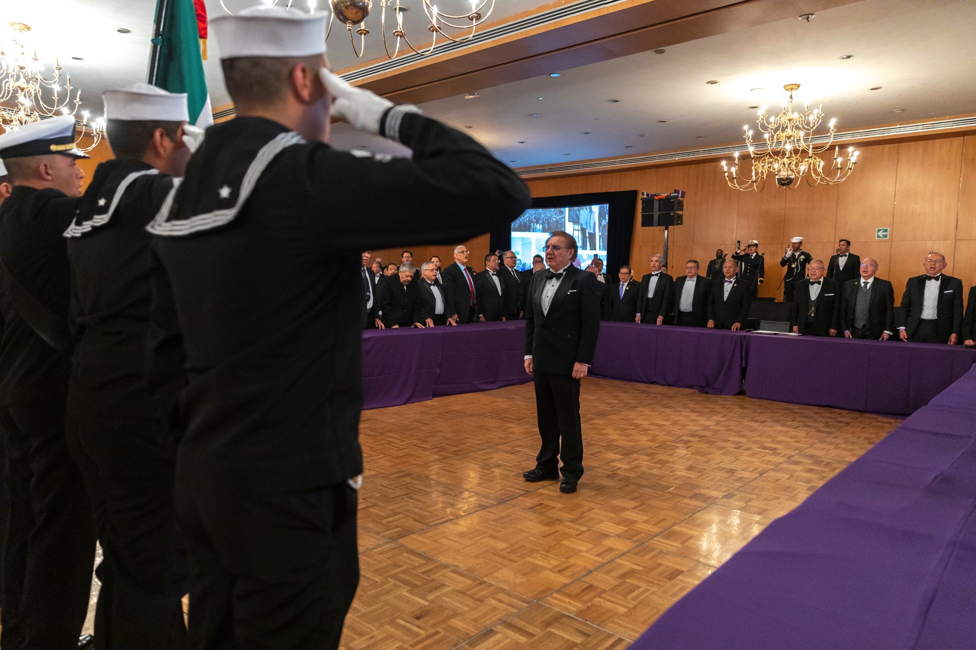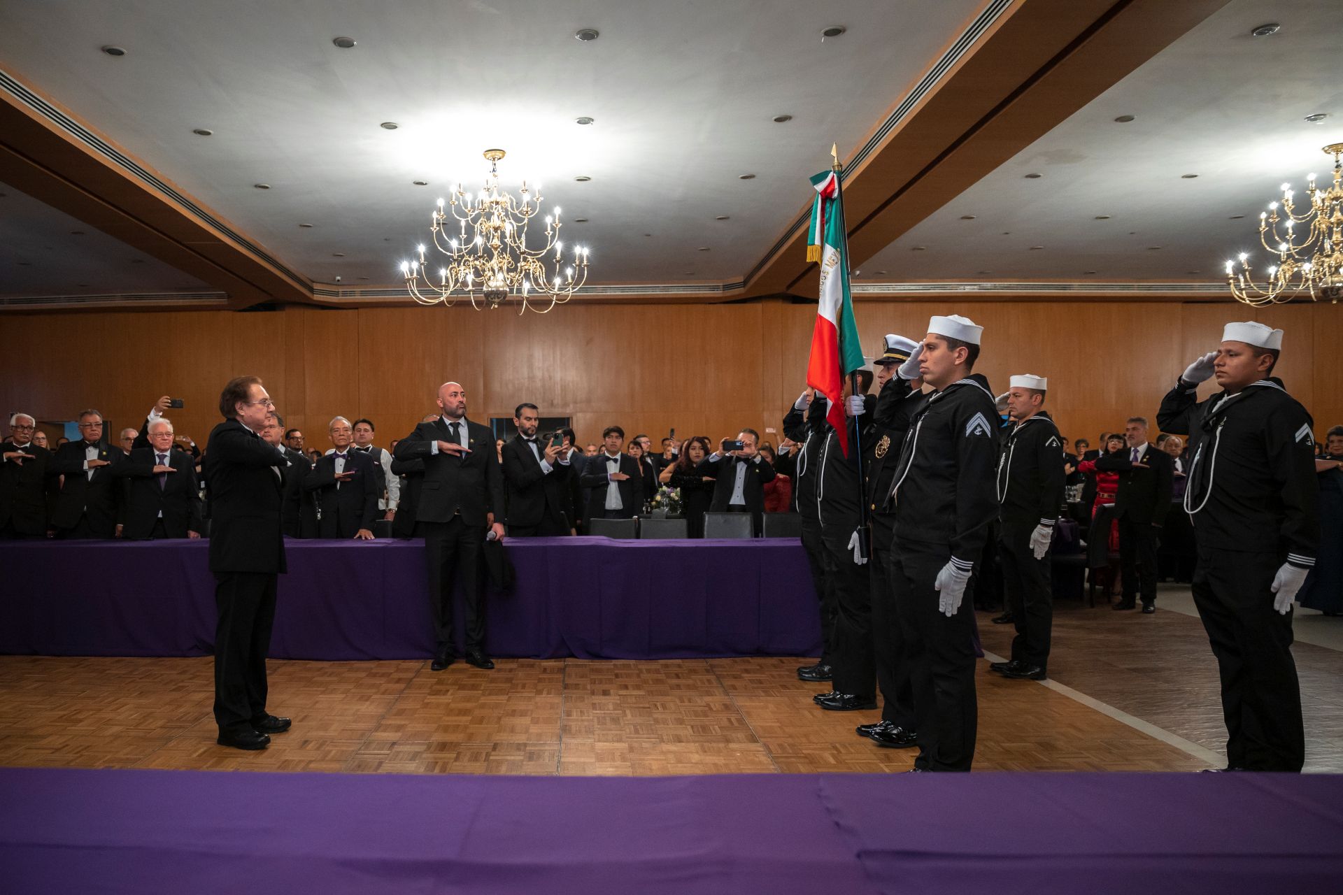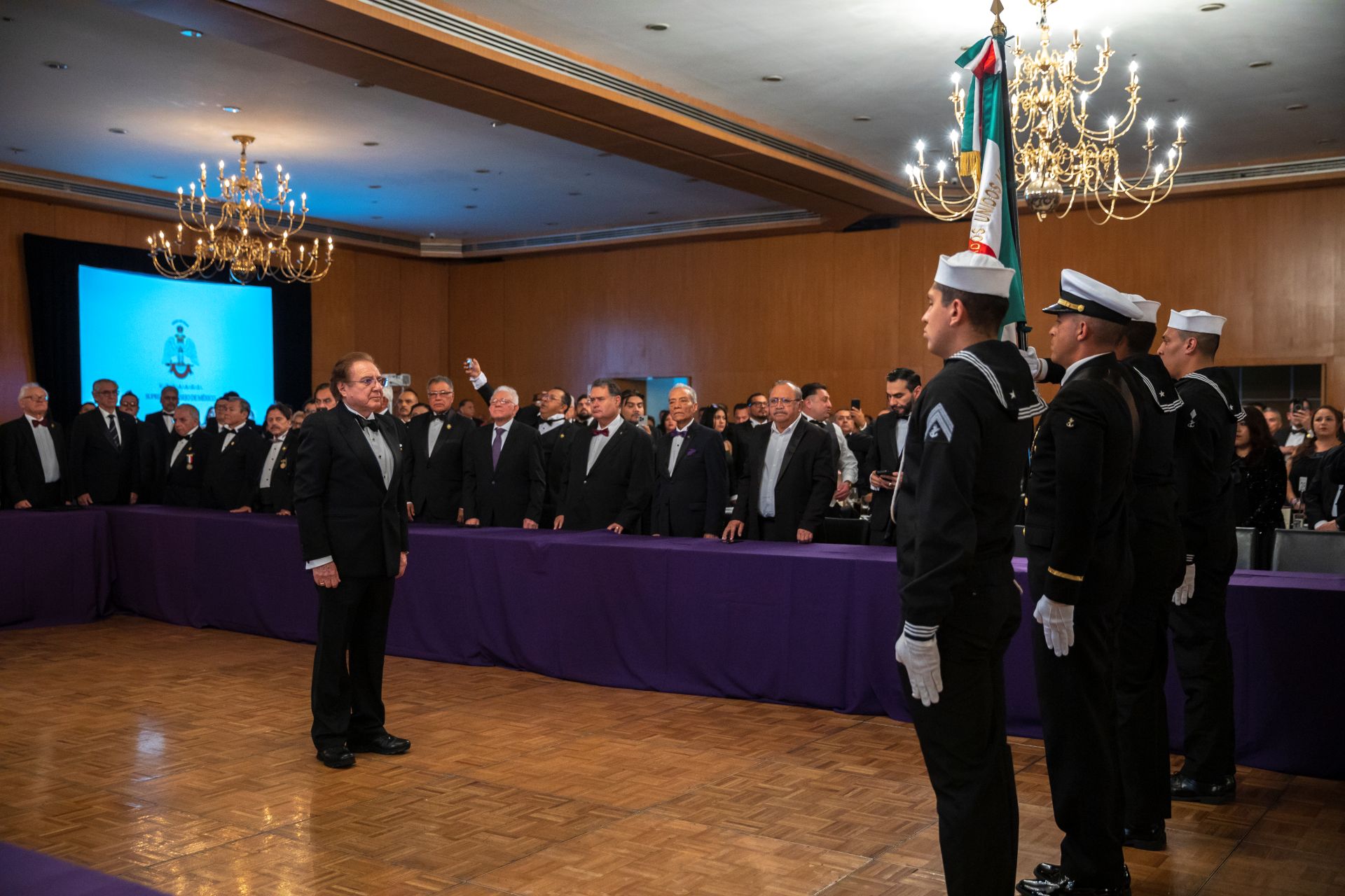 Como es tradición en los grandes eventos del Supremo Consejo de México, el acto protocolario inició con los Honores a la Bandera Nacional, a cargo de la Escolta y Banda de Guerra de la Secretaría de Marina, seguidos por la entonación del Himno Nacional Mexicano, interpretado con solemnidad por todos los presentes. La participación de la Banda de Guerra, que incluyó una destacada selección de marchas militares, imprimió un profundo sentido de patriotismo al evento.