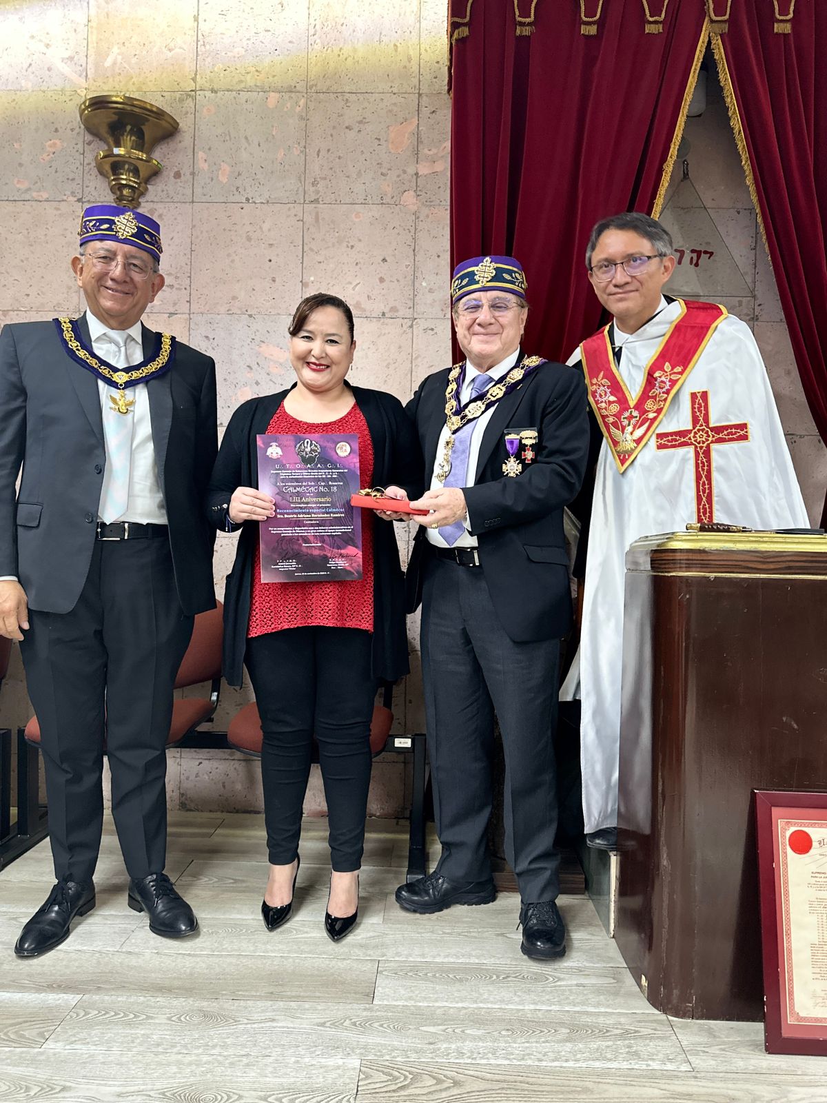 Mención especial merece el reconocimiento entregado a la Lic. Beatriz Adriana Hernández Ramírez, quien desde su posición en la Gran Secretaría ha dado un gran apoyo a los Cuerpos Filosóficos subordinados al Supremo Consejo de México.